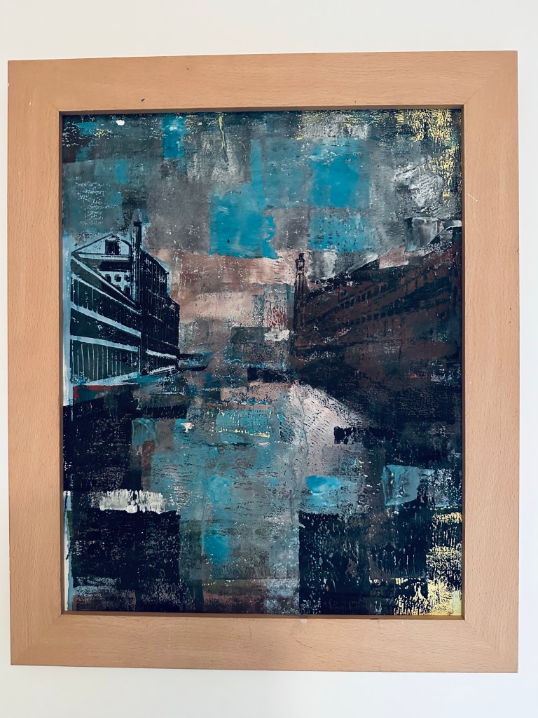 Atmospheric semi-abstract Linocut of the wonderful Leeds & Liverpool canal at Salts Mill!