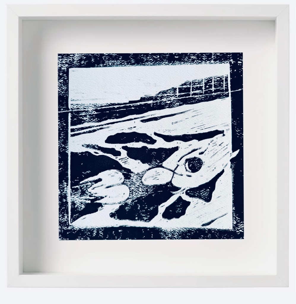 From DART to SEA… My Original Reduction Linocut inspired by the Sharpham Trust Wellness Retreat and the wonderful comments I have had about my work hanging there. Framed at 500×500 and priced at £140 plus £20 UK Pack/Del