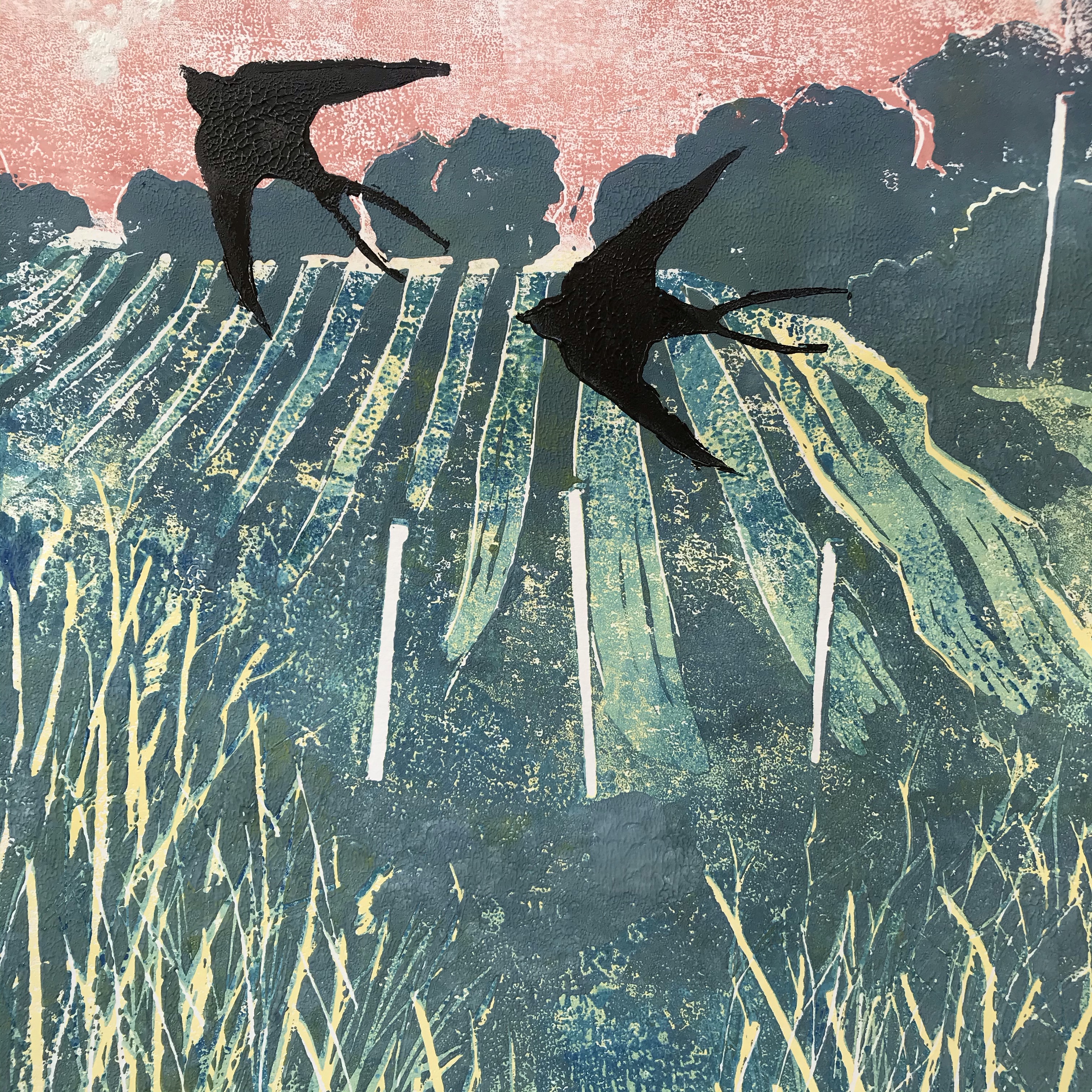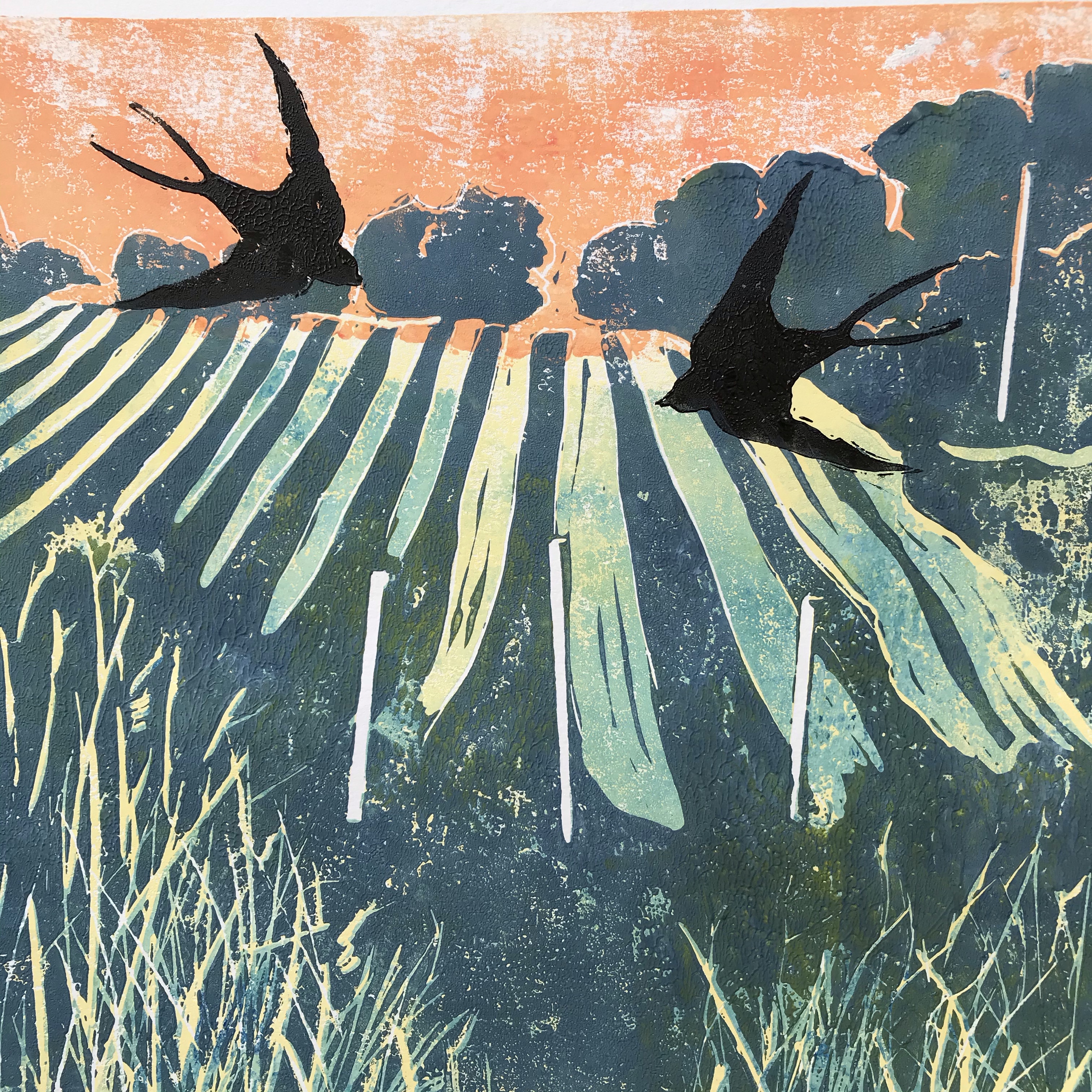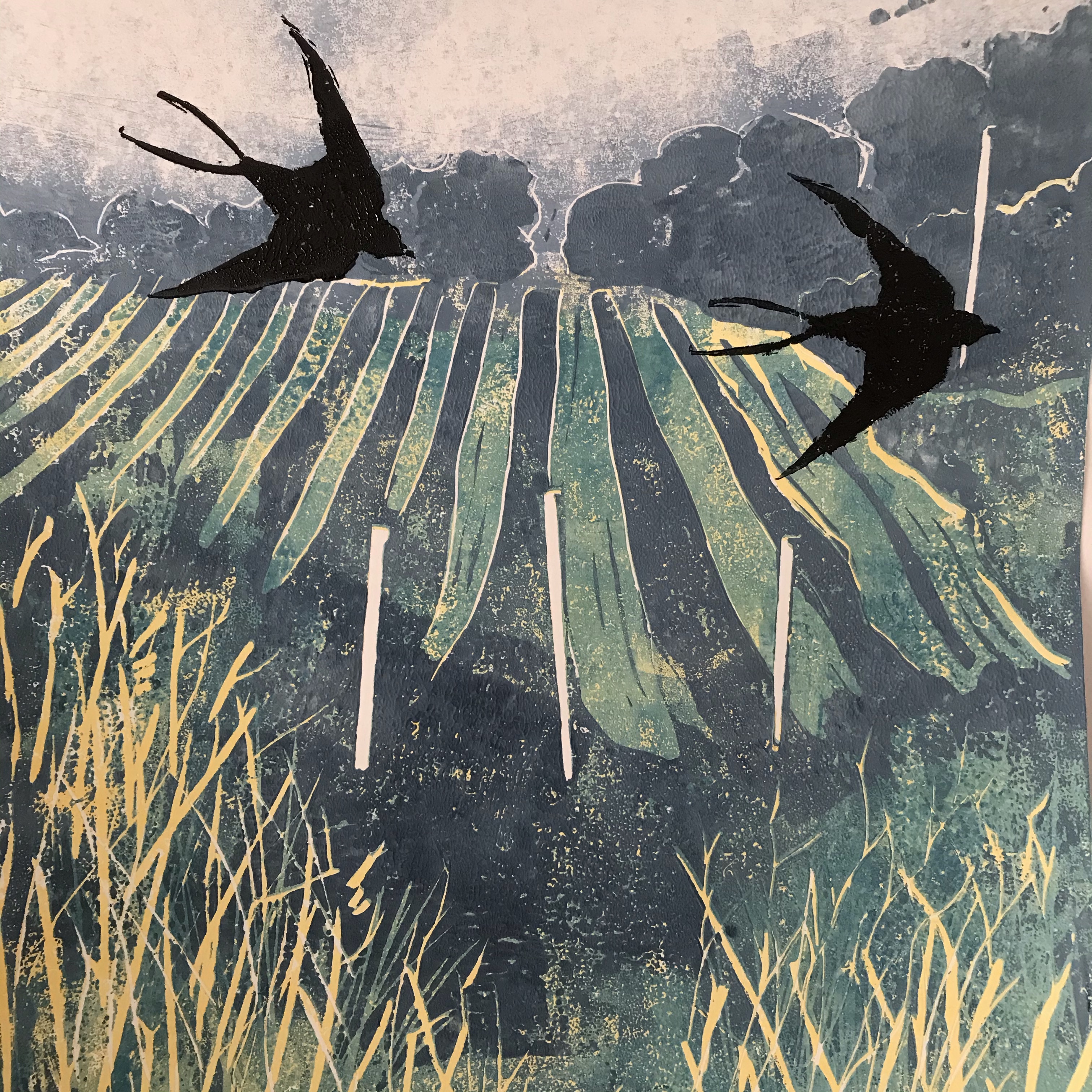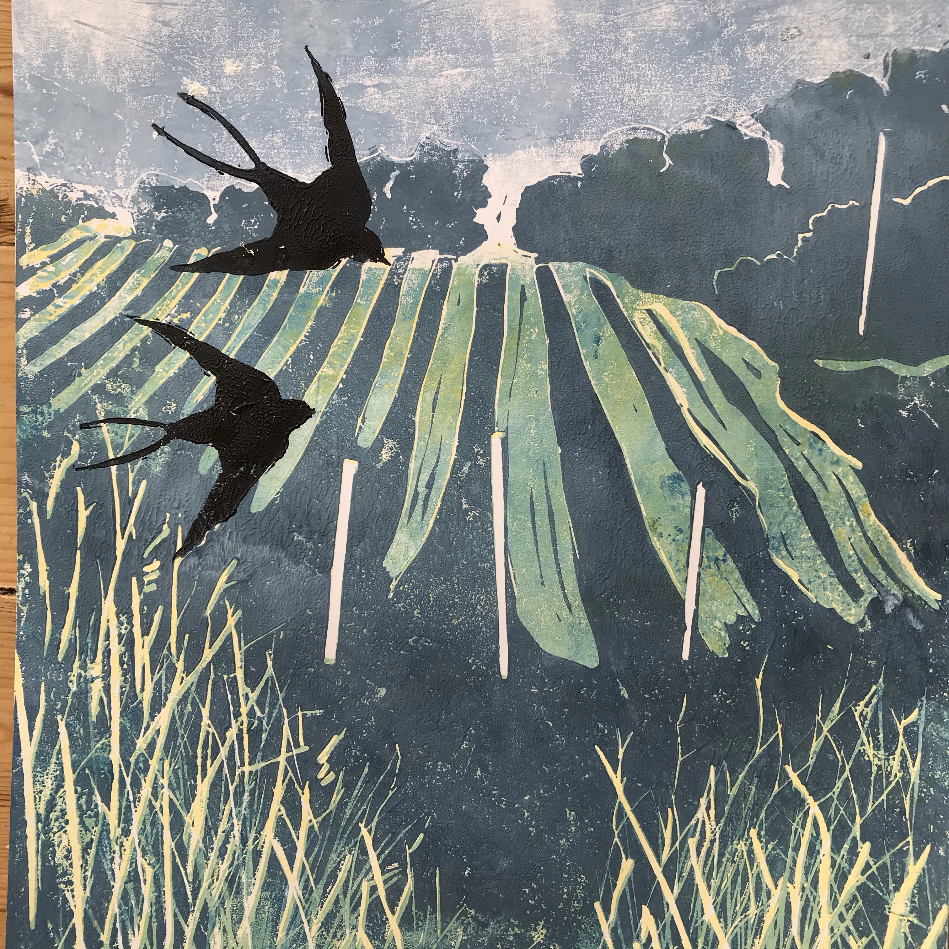Swallows over Old Walls Vineyard’ 4 original linocuts inspired by Old Walls Vineyard on the River Teign Estuary.
