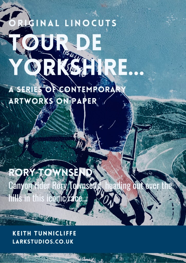 Today I entered into my 10th year of uploading a pic each day on to my social media! Not always art but an image each day that I find uplifting and an initiative I started to show that there is something every day that can cheer us up, or make us smile. This image is my 3288th in a row and is one of my personal favourite artworks I have created. My capture of family friend Rory Townsend riding in the Tour of Yorkshire was printed in an edition of four original linocut differing colour reductions, with his family purchasing the first.