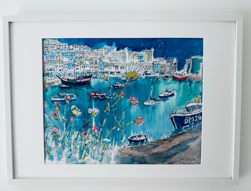 Inspired loose Watercolour from a pic I took through the wall top weeds looking over the harbour. Loved creating this in my loose and colourful style! 500×400 [Framed 725×525 £140 plus £20 Pack/Del]
