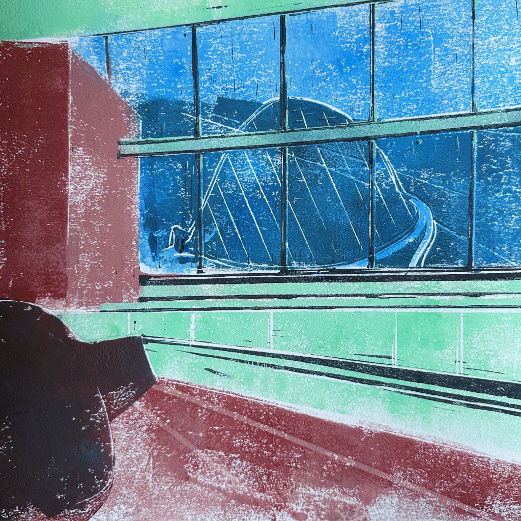 THROUGH THE WINDOW – Salts Mill – Original Linocut – 300×400 [Framed 400×500] £140 plus £20 UK Pack/Del.
