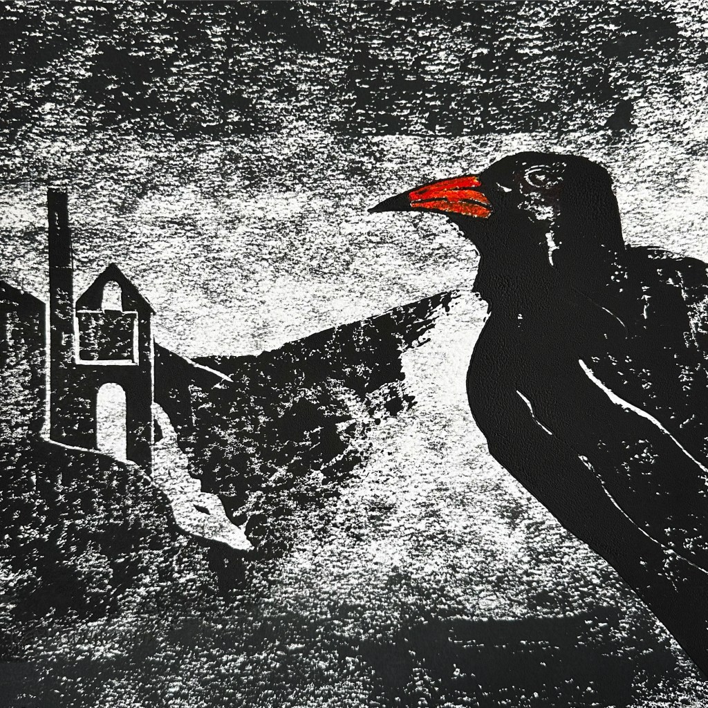 CORNISH CHOUGH – Original Linocut – Framed 50×50 – £140 plus £20 UK Pack/Del