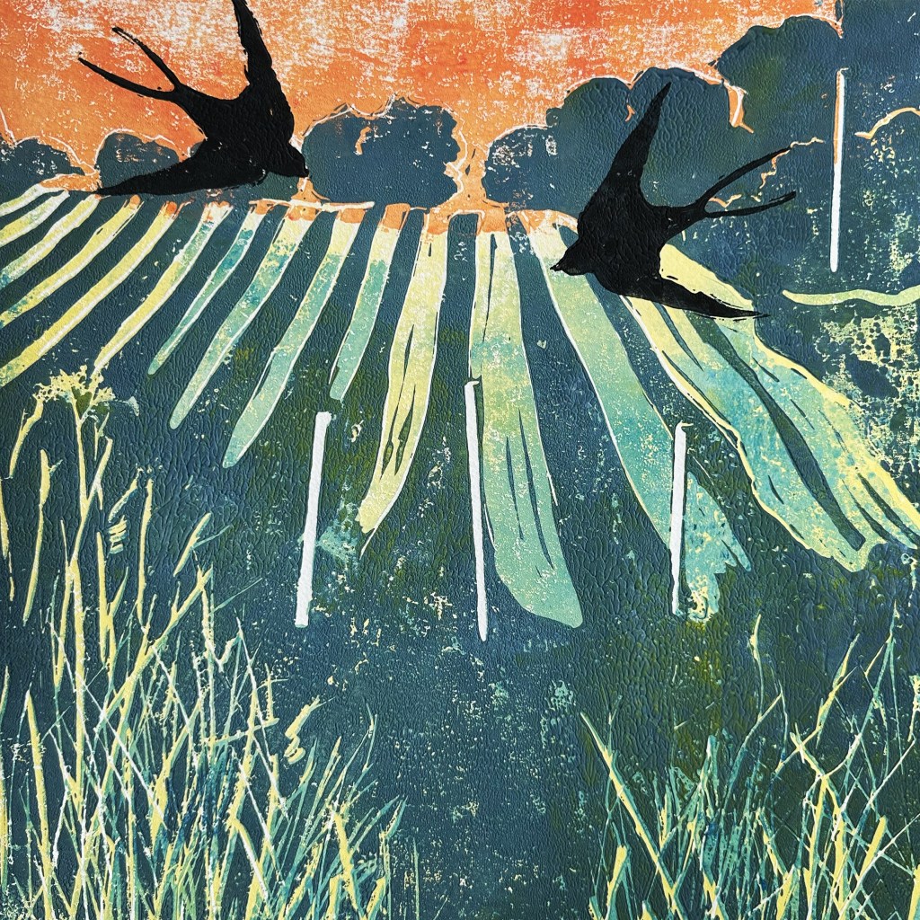 SWALLOWS – Original Linocut – Framed 50×50 – £140 plus £20 UK Pack/Del