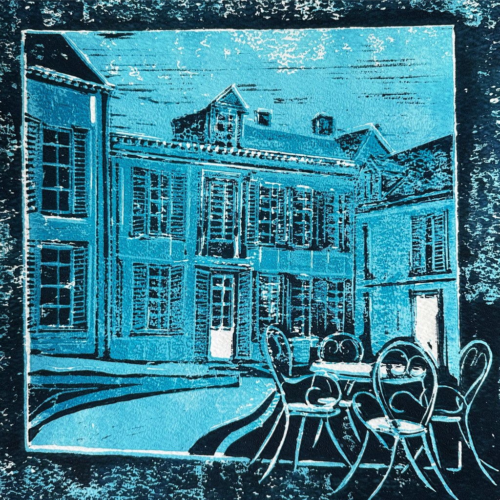 CHATEAU LIFE – Original Linocut – Framed 50×50 – £140 plus £20 UK Pack/Del