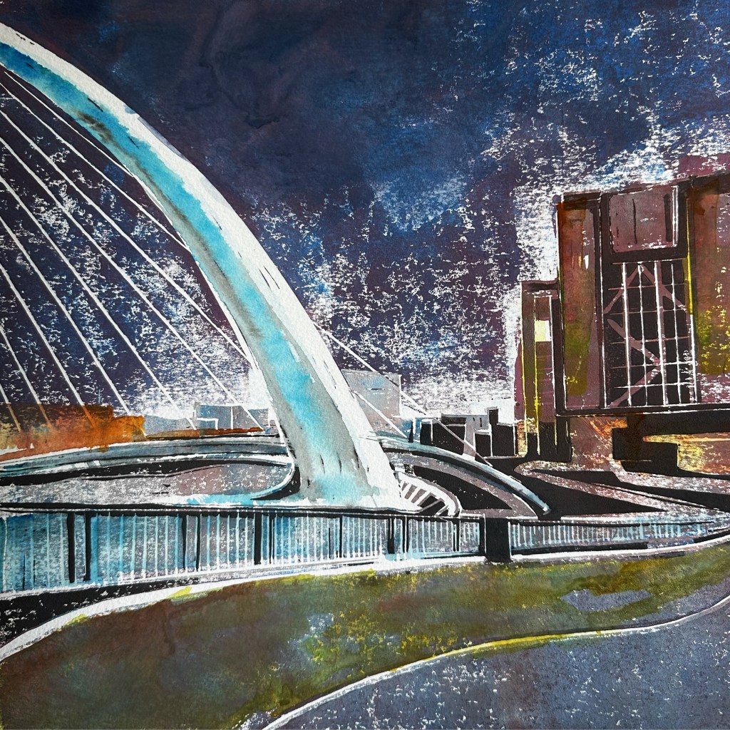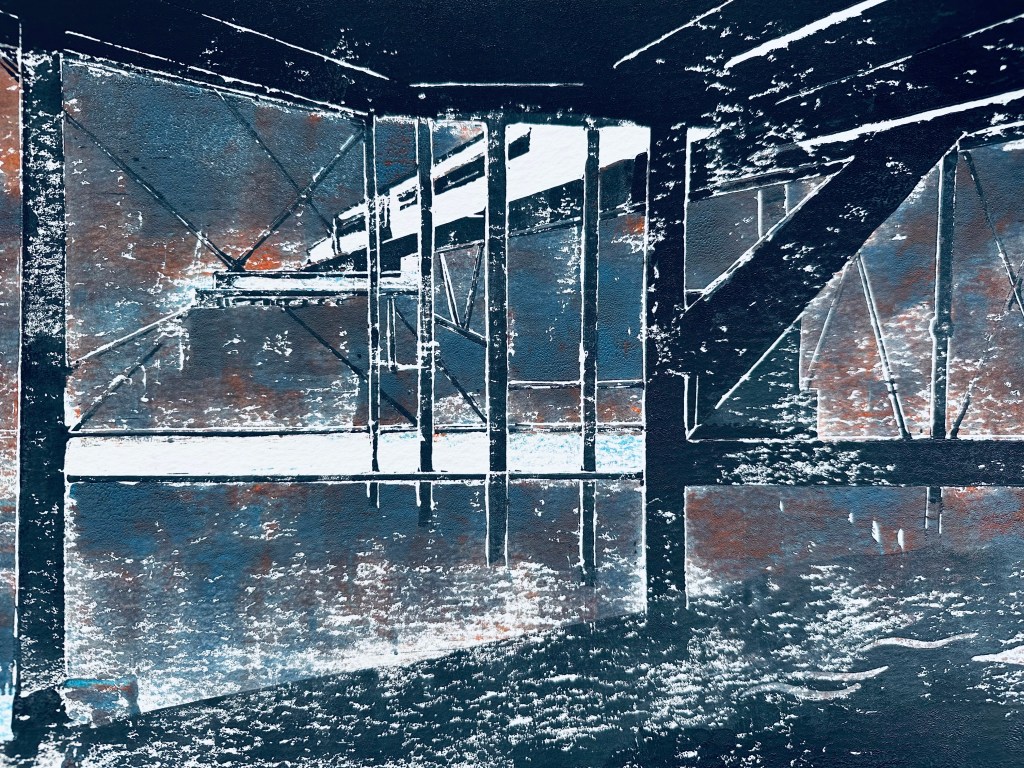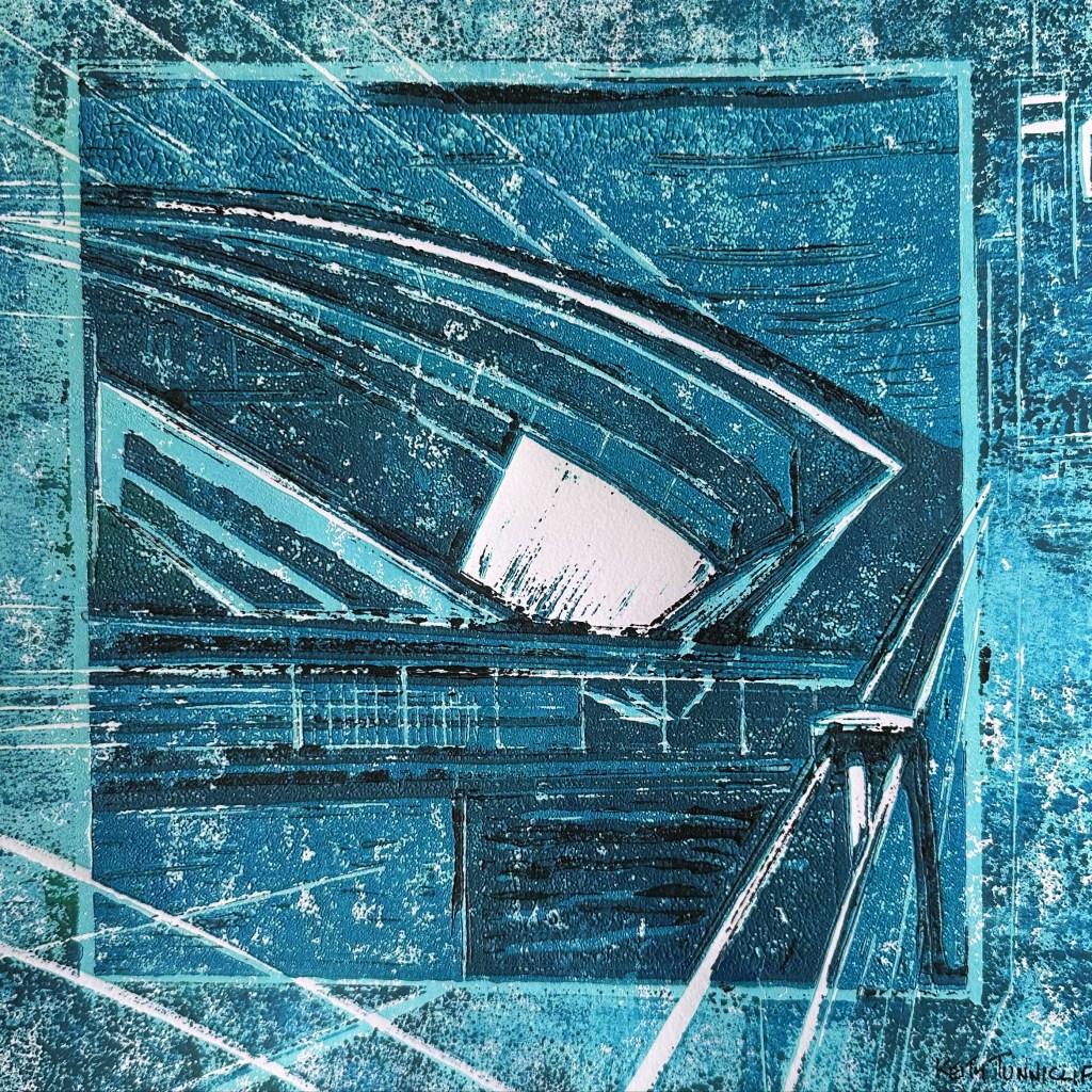 ABSTRACT BRIDGE – Original Linocut – Framed 50×50 – £140 plus £20 UK Pack/Del – As featured on Landscape Artist of the Year