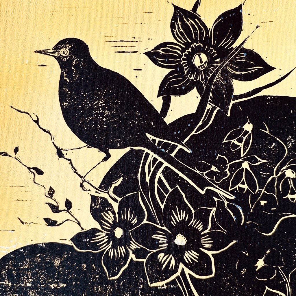 BLACKBIRD – Original Linocut – Framed 50×50 – £140 plus £20 UK Pack/Del