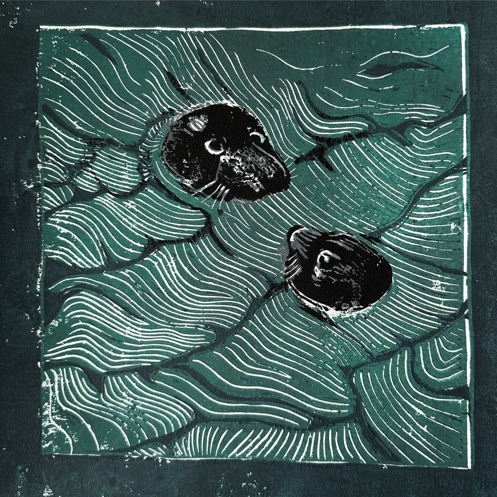 SEALS AT PLAY – Original Linocut – Framed 50×50 – £140 plus £20 UK Pack/Del