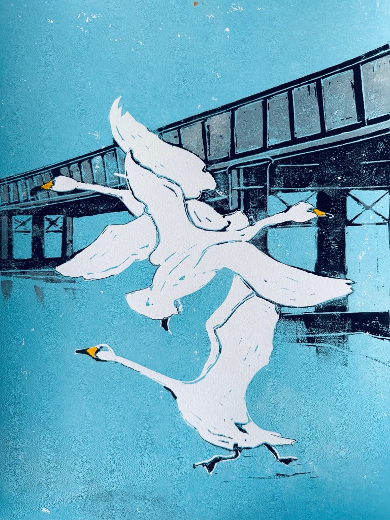 SWANS IN FLIGHT – Original Linocut – Framed 40×50 – £140 plus £20 UK Pack/Del – As featured in The Artist Magazine