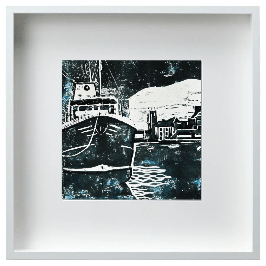 HARBOUR LIFE – Original Linocut – Framed 50×50 – £140 plus £20 UK Pack/Del