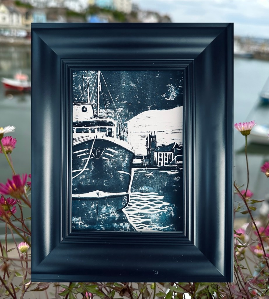 BRIXHAM – Original Linocut – Framed 50×50 – £140 plus £20 UK Pack/Del