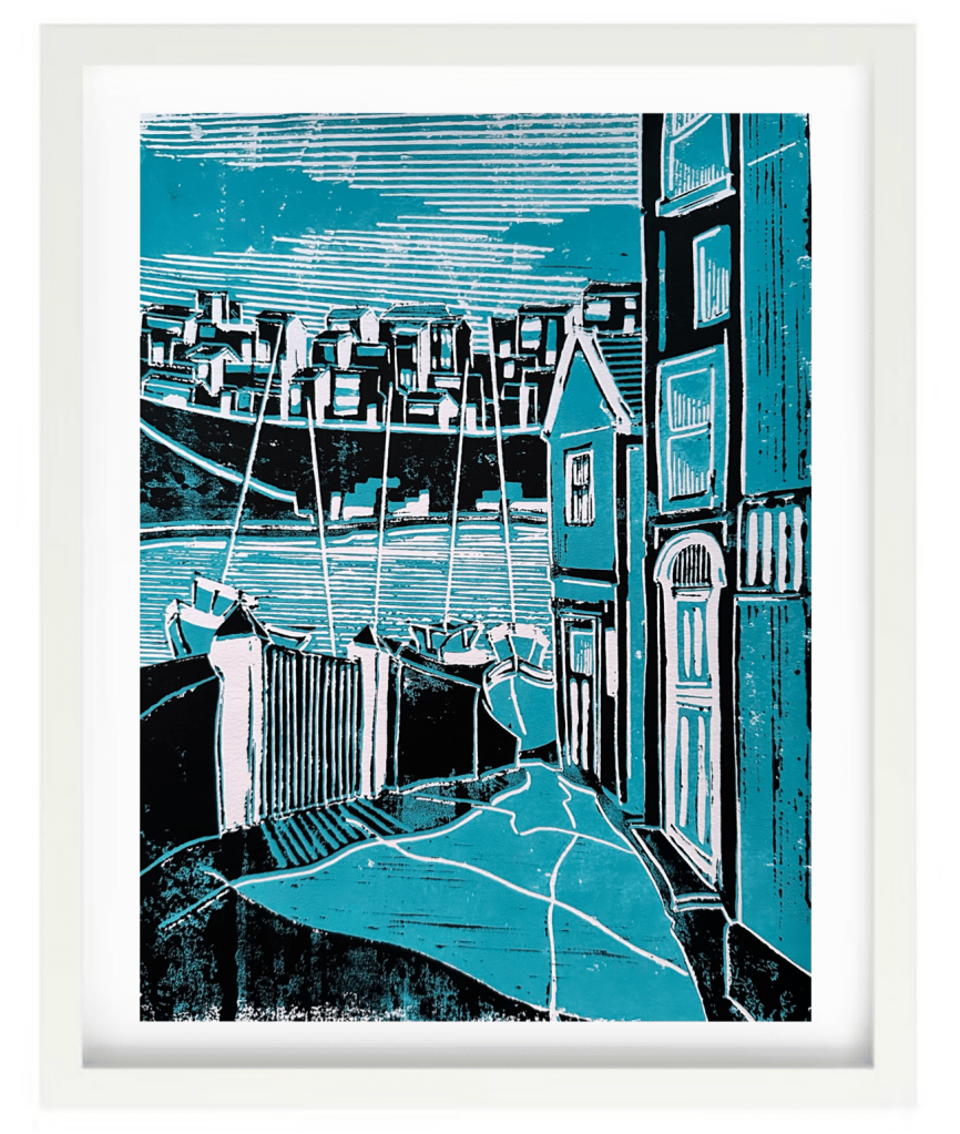 VIEW FROM OVERGANG – Original Linocut – 300×400 [Framed 400×500] – £140 + £20 UK Pack/Del.